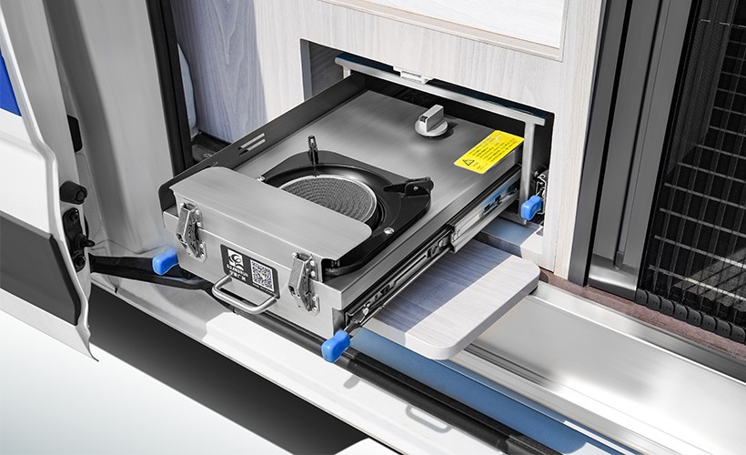 車內(nèi)配備冰箱、空調(diào)、電磁爐,抽拉燃?xì)庠?邊上還加裝了一個(gè)用電插座,滿足戶外做飯需求。
