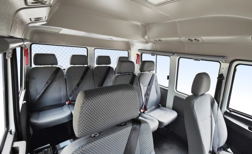 工程車(chē)在使用過(guò)程中的一項(xiàng)功能是隨車(chē)運(yùn)載相關(guān)工具和設(shè)備,分別在車(chē)頂設(shè)置有固定設(shè)備用的行李架和后爬梯,貨箱區(qū)域四周設(shè)置圍欄,增加車(chē)輛運(yùn)載貨物運(yùn)載功能。后擋風(fēng)玻璃裝置金屬網(wǎng),避免行駛過(guò)程沖貨物沖擊駕乘區(qū)。貨箱為對(duì)開(kāi)門(mén)狀態(tài)并配合登車(chē)踏板,最大限度的方便貨物拿取。駕乘區(qū)域可以滿(mǎn)足6-9人乘坐,頂部?jī)蓚?cè)設(shè)計(jì)多個(gè)空調(diào)出風(fēng)口。側(cè)窗為封閉式和推拉式配合設(shè)計(jì),均配置有下拉式窗簾。