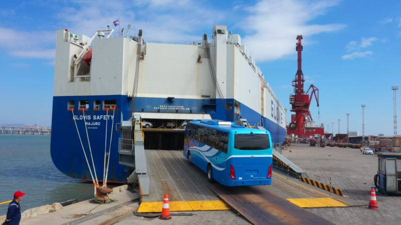 在碼頭整裝待發(fā)的金旅客車