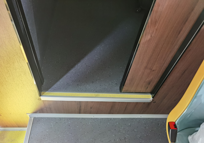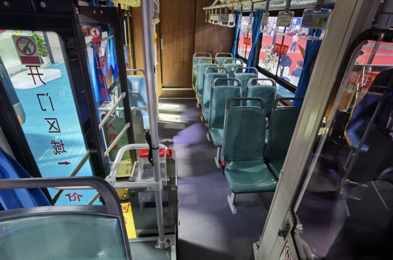 車廂中部設(shè)有11個(gè)乘客座,前部副駕駛1個(gè)正向乘客座,整體為典型的城鄉(xiāng)公交車雙排座椅布局形式。二級(jí)踏步,安裝32寸LCD導(dǎo)乘屏、上下客門迎賓燈、USB充電口等設(shè)施,并預(yù)留有上下車刷卡線纜。