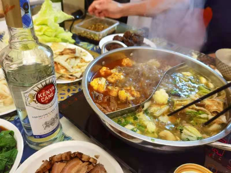 團(tuán)圓飯是火鍋。他們?nèi)ナ袌?chǎng)買(mǎi)點(diǎn)當(dāng)?shù)夭耍米约撼霾铍S身帶的鍋,放一些底料就這樣吃了起來(lái)。由于經(jīng)常在非洲出差,生活條件不怎么好,鍋碗盆他們都會(huì)隨身帶著。