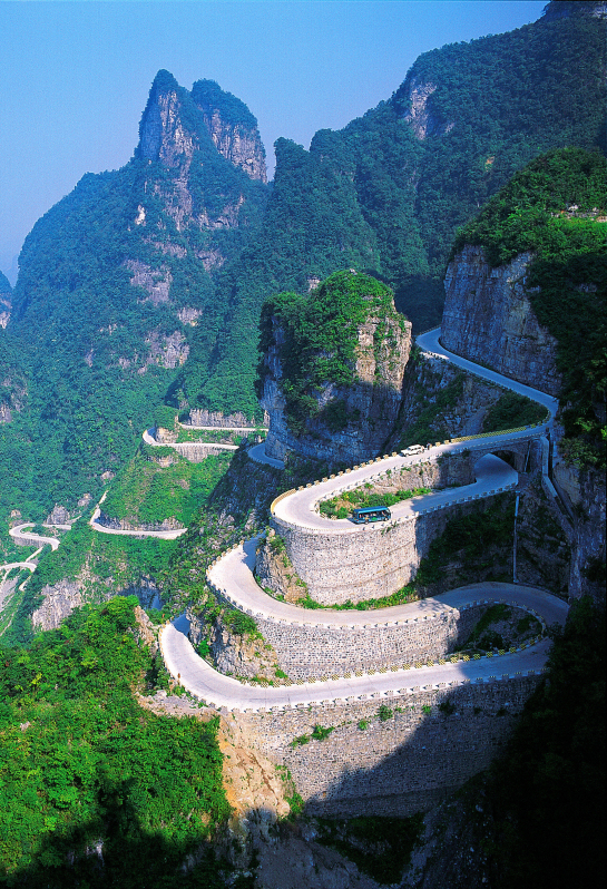 天門山蜿蜒99道彎,正是金旅考斯特每天的工作線路